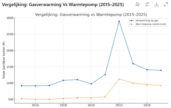 • 2023–2025: Gaskosten dalen, maar warmtepomp blijft structureel goedkoper.
